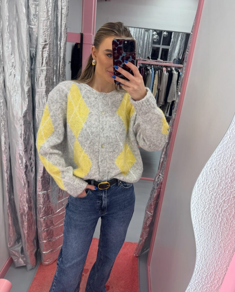 Pilkas megztinis su geltonais rombais