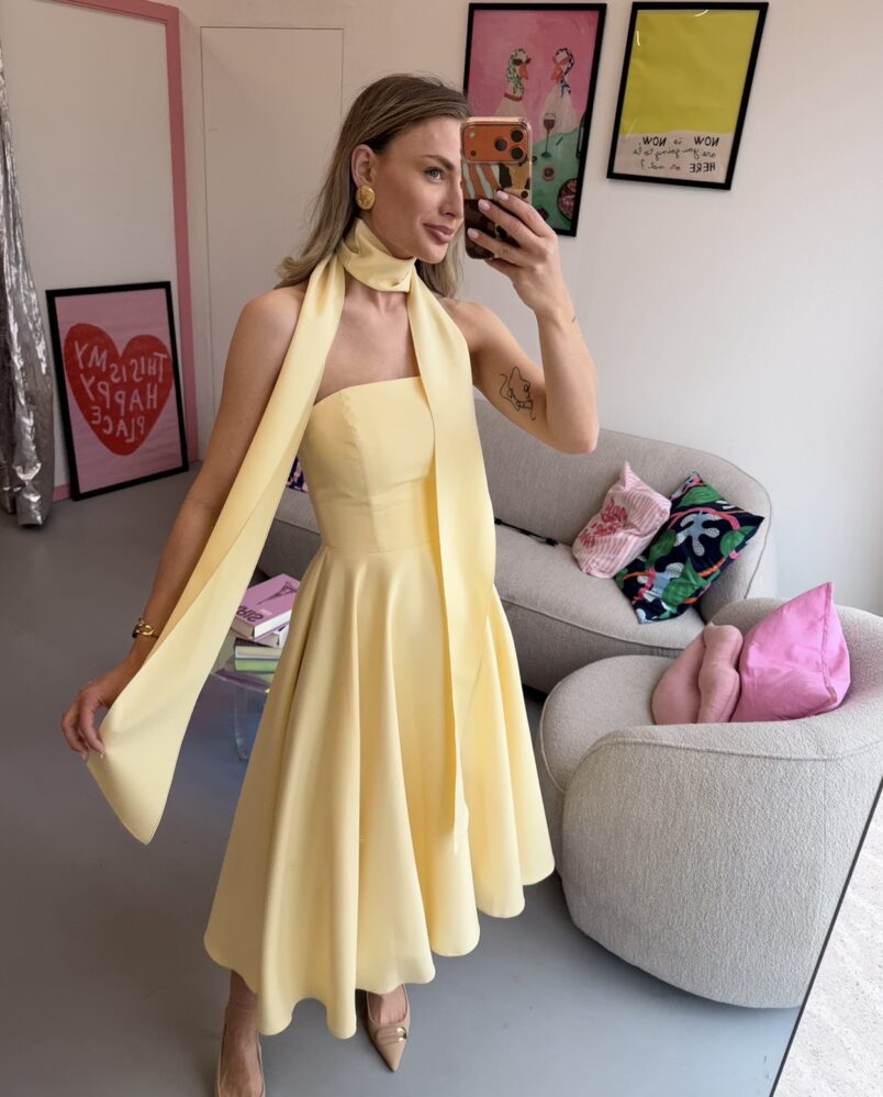 Geltona, korsetinė suknelė