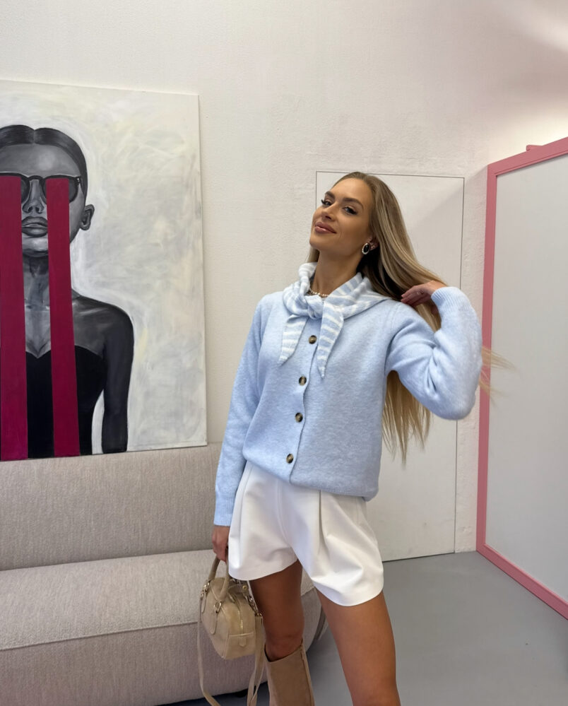 Baby blue megztinis su dryžuotu šalikėliu /2019