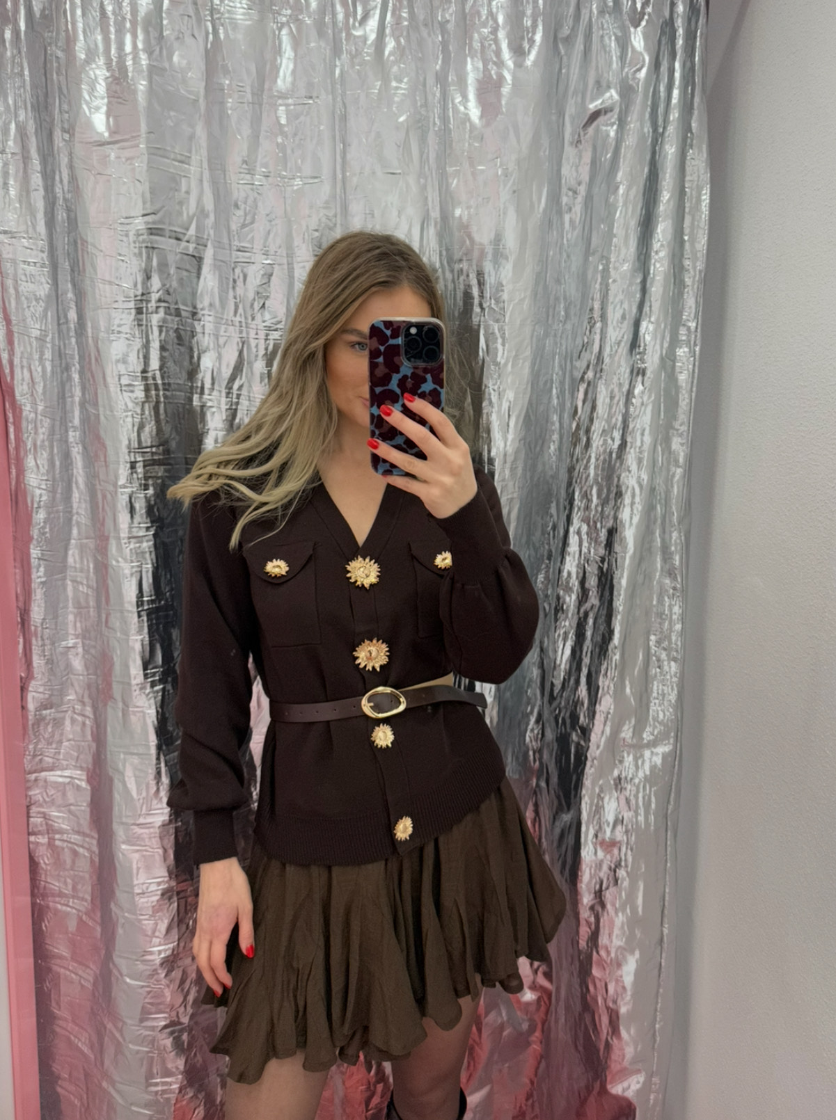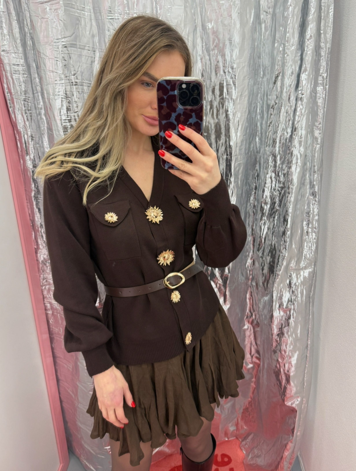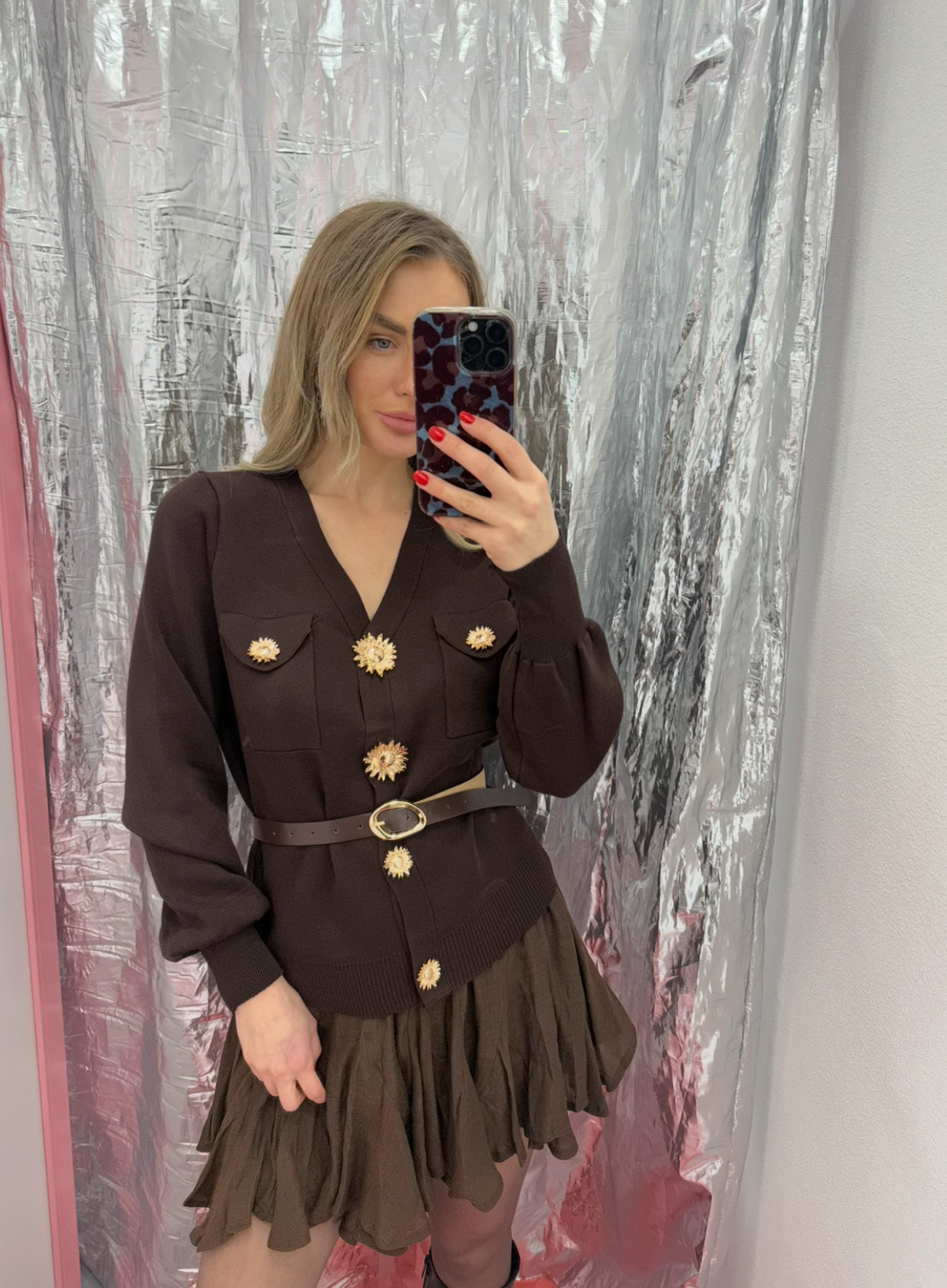Rudas megztinis su auksinėm išskirtinėm sagom ir dirželiu / HYY569