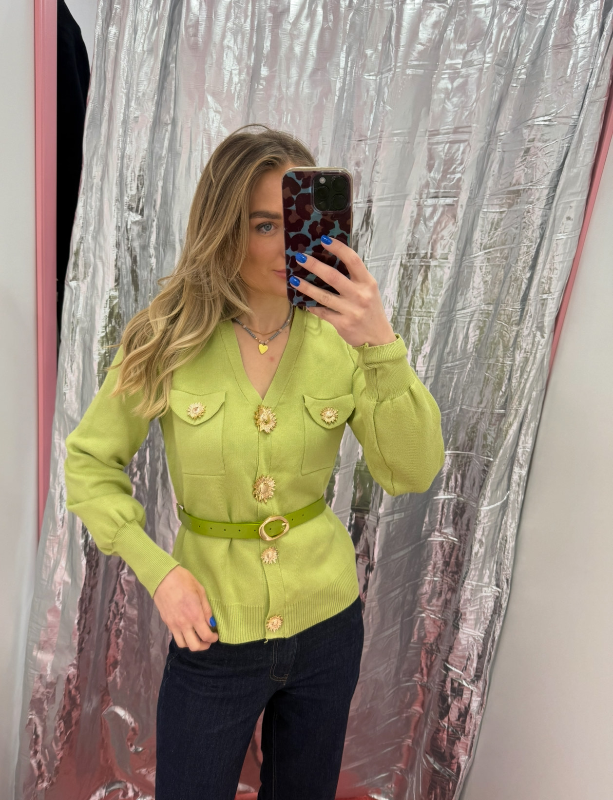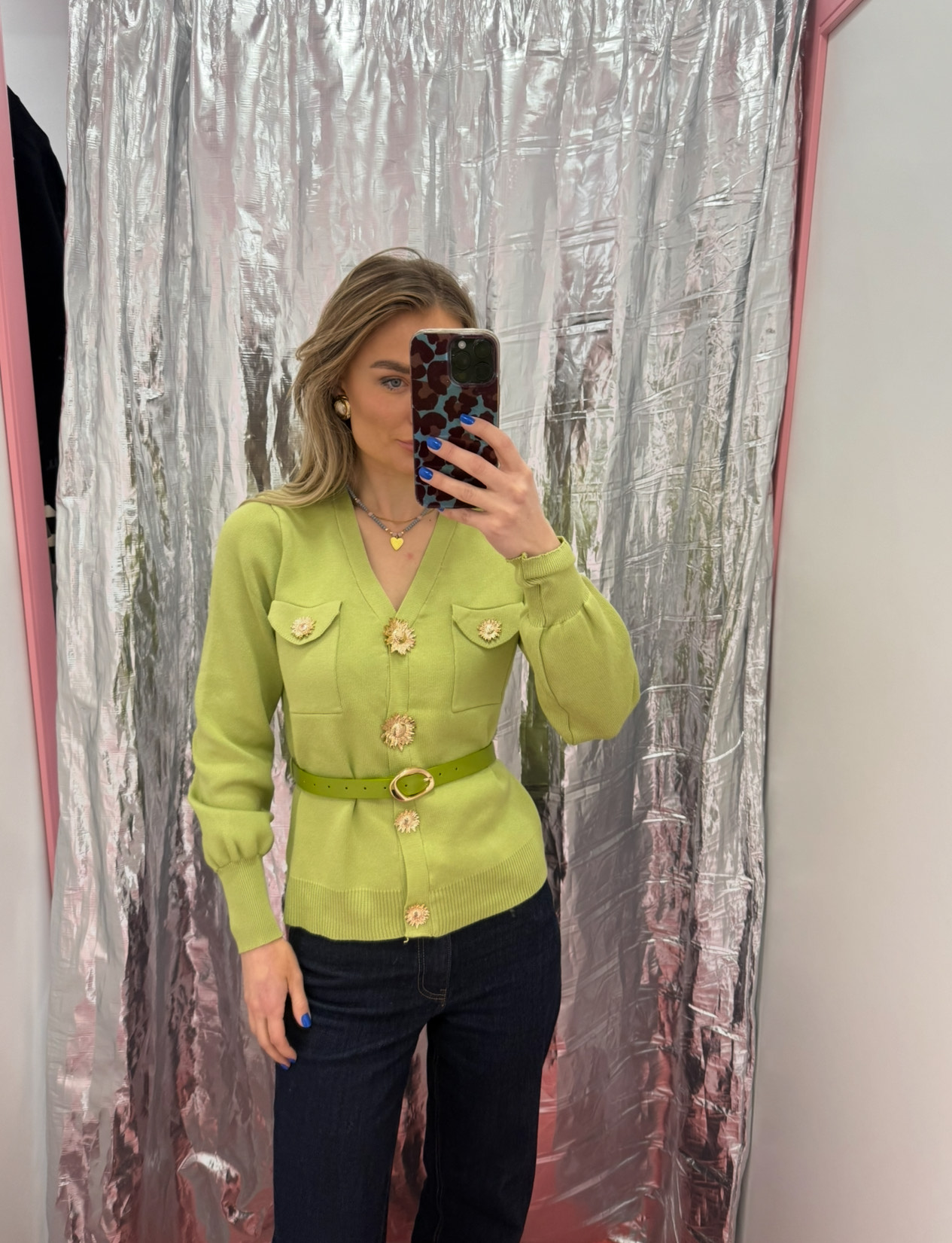 Būkite pirmas aprašęs “Samanų megztinis su auksinėm išskirtinėm sagom ir dirželiu / HYY569”