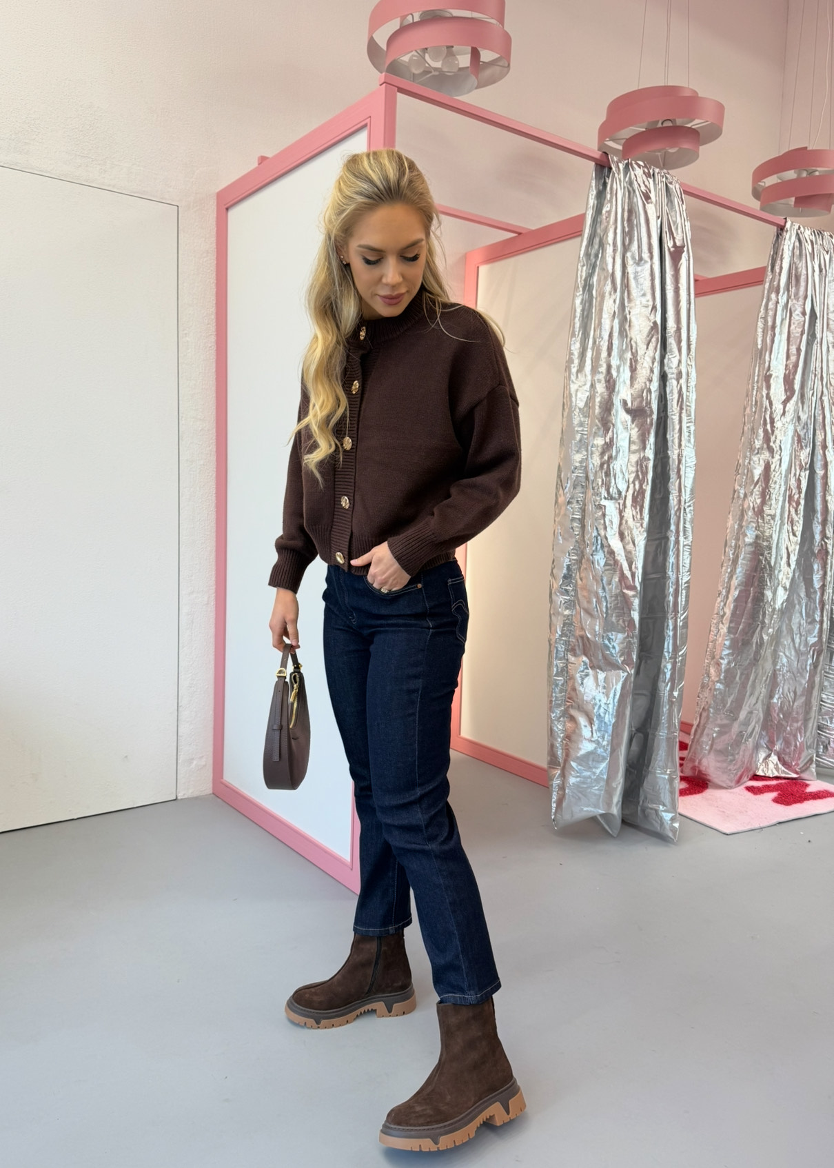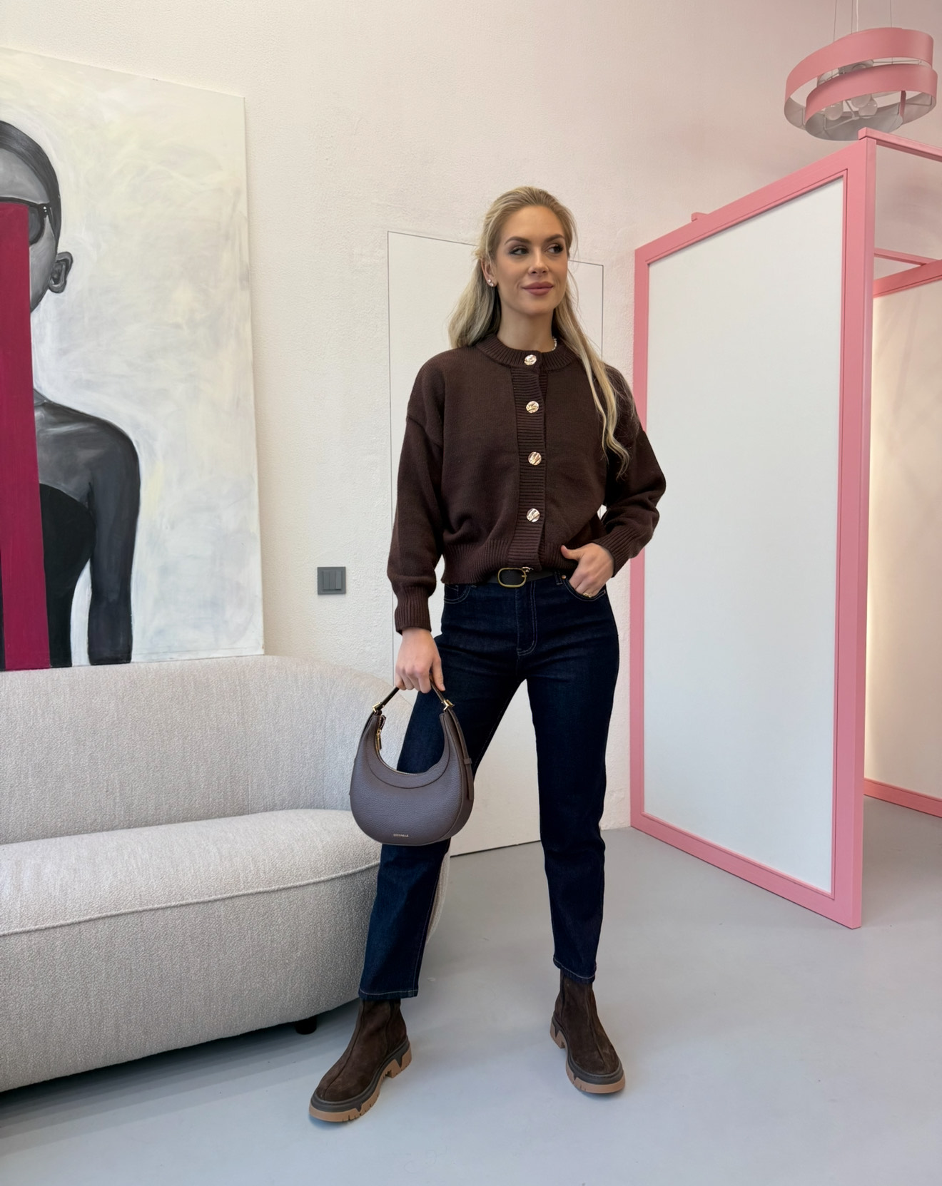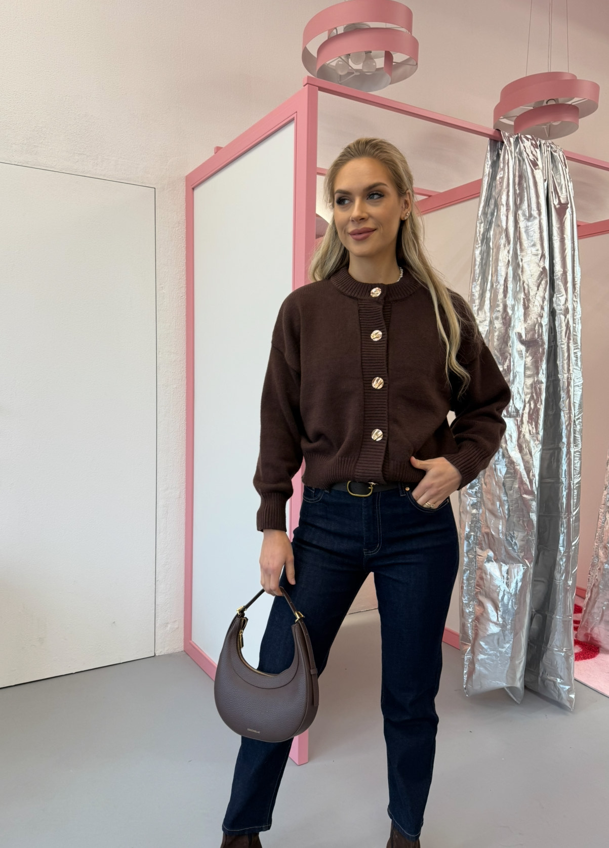 Tamsiai rudas megztinis su auksinėmis sagomis