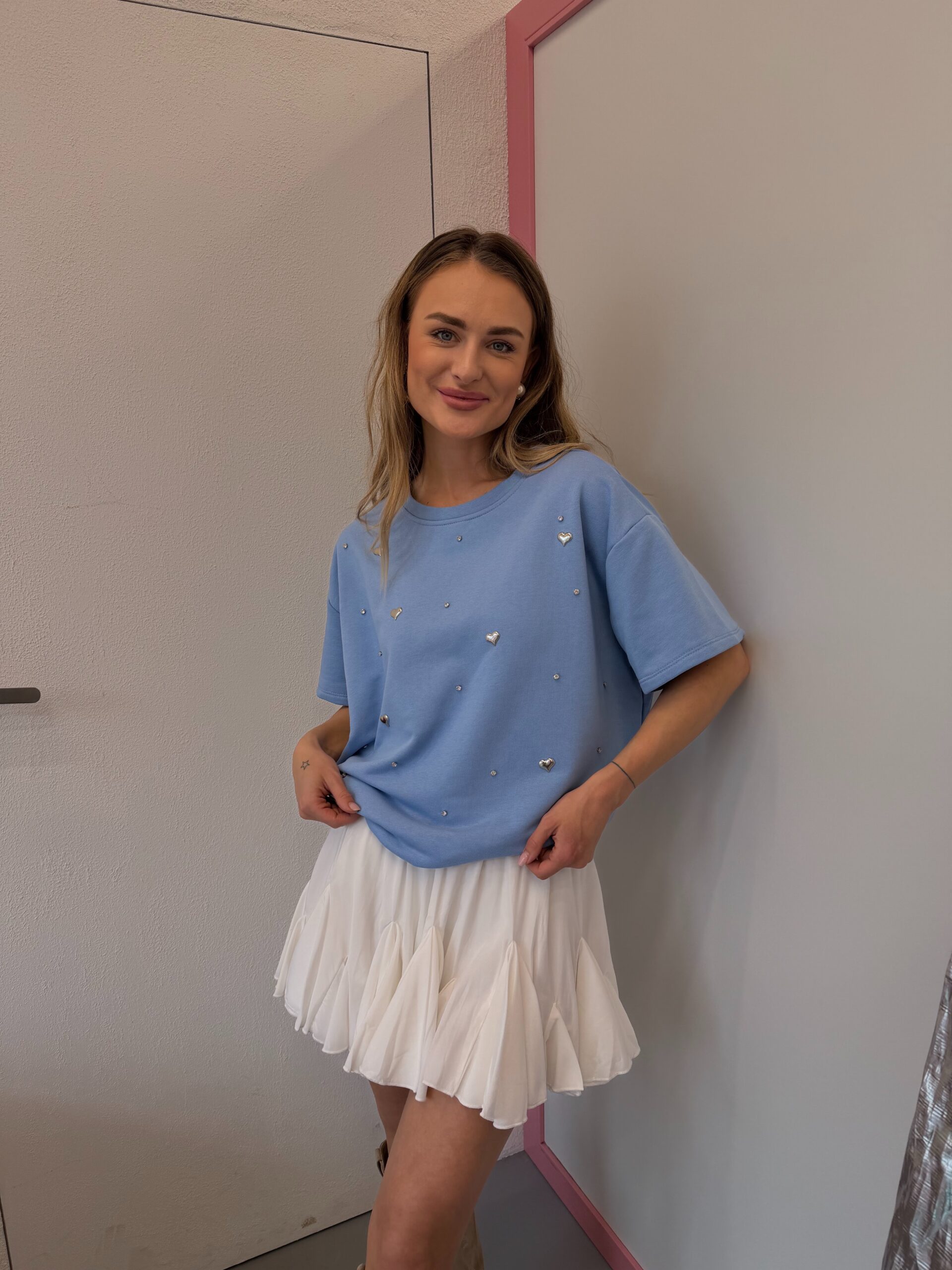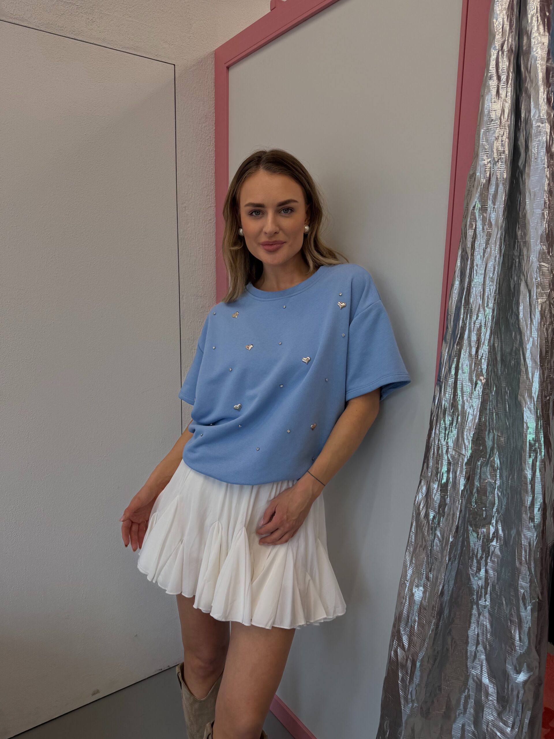 Žydras džemperis su širdelėmis, trumpintom rankovėm